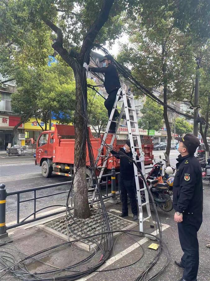 3月23日早上,长青街城管队员巡查时发现电线杆斜卧在路边,横跨人行道和车行道,水泥渣和带出来的泥土撒得到处都是,拉断的电线一部分散落在地面,一部分搭在了路边商户的房顶,既影响了路边的环境秩序,又给行人和路过的车辆造成困扰。执法队员当即疏散人员,设立隔挡,联系电线各权属部门,并通知街道城管环卫人员赴现场处置。