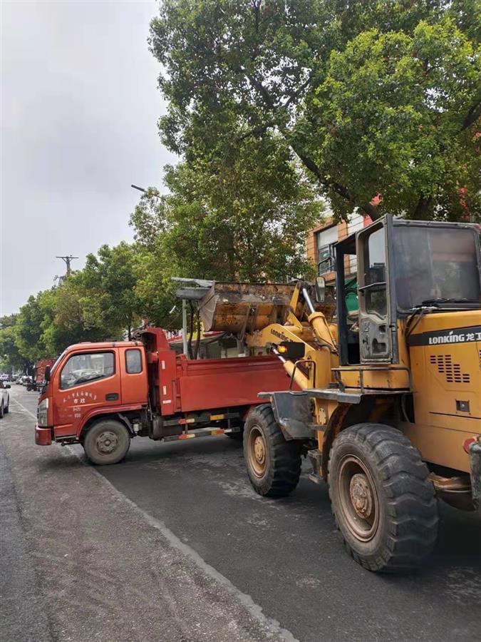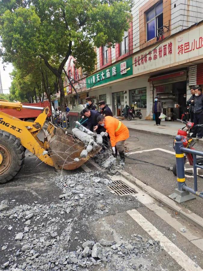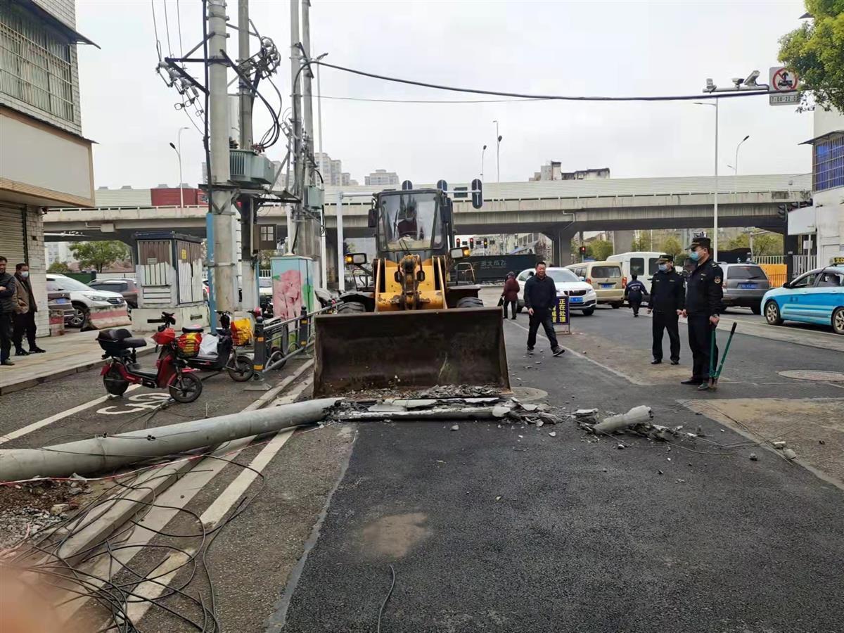队员在确认此处均为废旧电线电缆后,果断剪断散落的电线,用大铁锤将电线杆锤断,最后再安排铲车清理。为免给行人留下安全隐患,执法人员和环卫人员还一起拔除路面残留的铁钉并清理干净撒落的泥土,经过近2个小时努力,附近道路恢复了通畅。