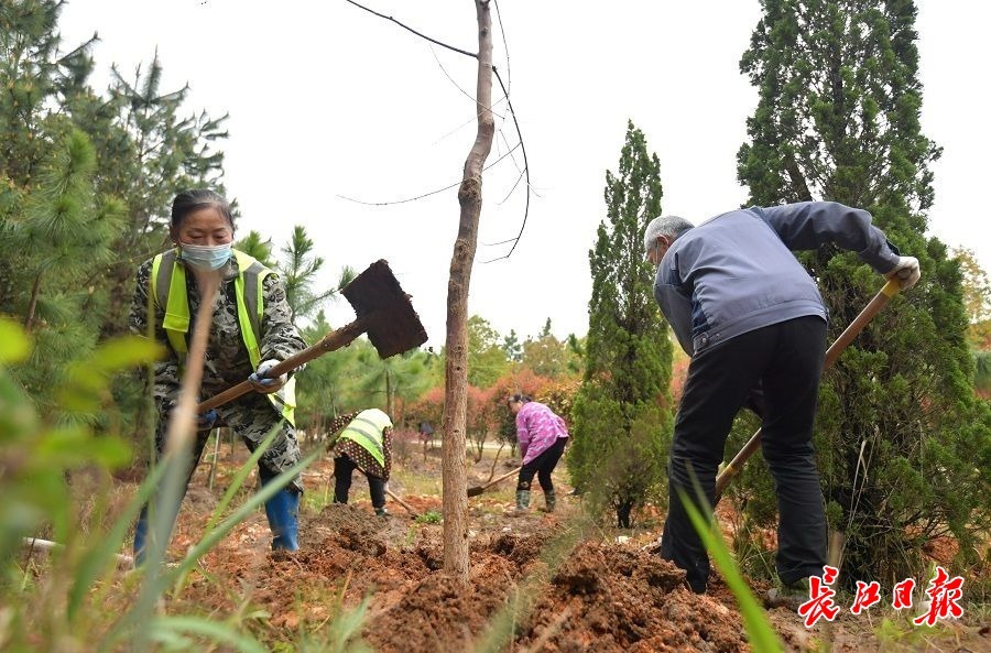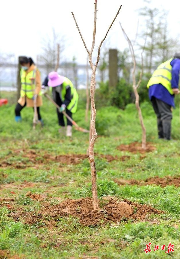 长江日报记者开心地参与了栽植活动。将树根裹上泥浆,扛起它们走到树坑前,放入栽植坑,培土、踩实、再培土……看着树苗挺立,记者内心满是喜悦,充满了期待,更觉浑身有劲,于是又去种下另一棵树苗。