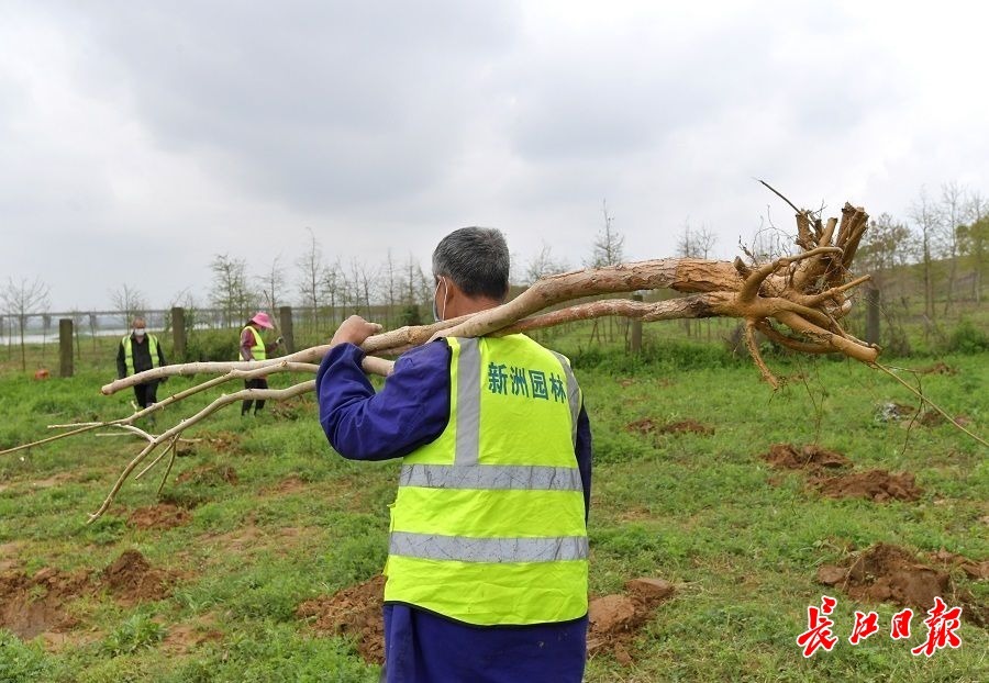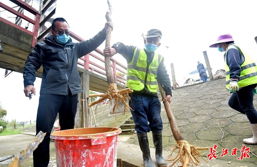 恰逢武汉连日阴雨,树苗一直未及栽种,区林业部门很是着急。得知23日不再下雨,他们随即组织人力,将树苗分种在举水河、倒水河畔。