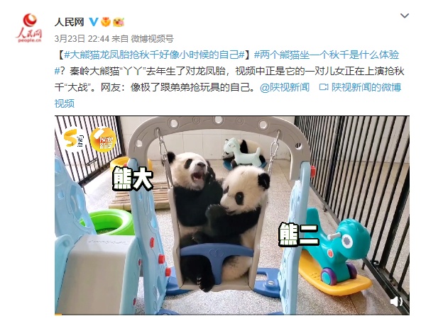 两个熊猫坐一个秋千是什么体验?秦岭大熊猫“丫丫”去年生了对龙凤胎,视频中正是它的一对儿女正在上演抢秋千“大战”。网友:像极了跟弟弟抢玩具的自己。