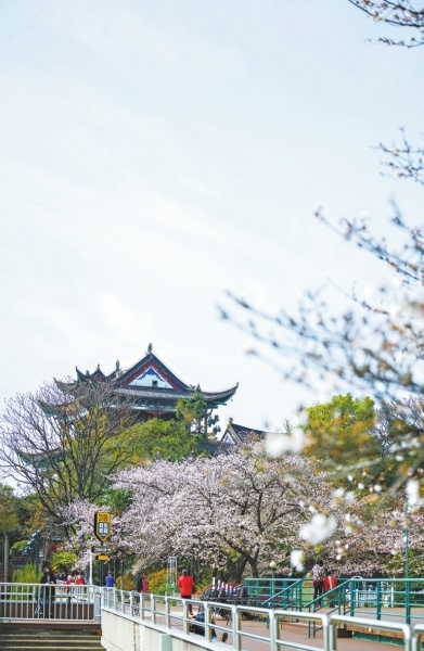 3、晴川假日饭店:百余株樱花花开七成,正在盛花期。在樱花树下远望古雅的晴川阁,回望长江大桥,别有韵味。