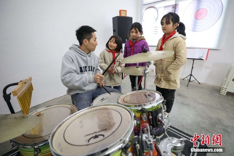 位于大山深处的贵州省遵义市凤冈县新建镇大水完小,有一支由8名不同年级学生组成的“打火石”乐队。“打火石”乐队是大水完小两位音乐专业特岗教师在2021年进行“双减”工作探索中,为丰富学生课后服务活动而组建的摇滚乐队。乐队的成员利用每天大课间以及课后服务时间学习各类乐理知识和乐器使用技巧。目前,在教师的指导训练下,成员们的演奏和演唱能力越来越成熟。指导教师樊彪说,希望孩子们能像打火石一样,通过音乐点燃热情,演绎精彩人生。图为3月24日,指导教师樊彪在教授“打火石”乐队成员打架子鼓。 中新社记者 瞿宏伦 摄