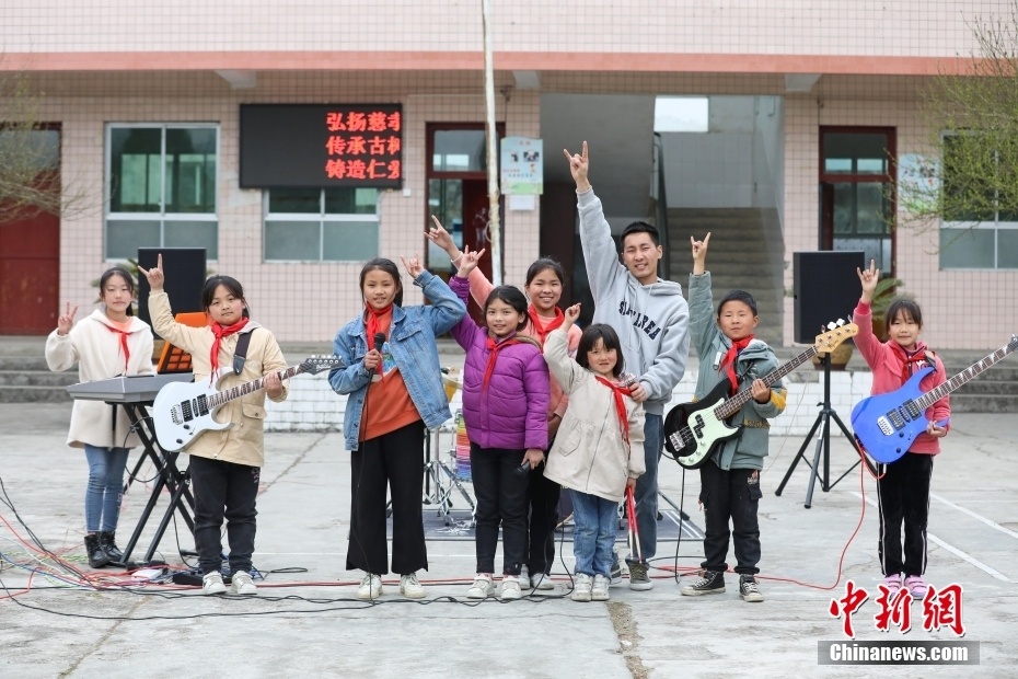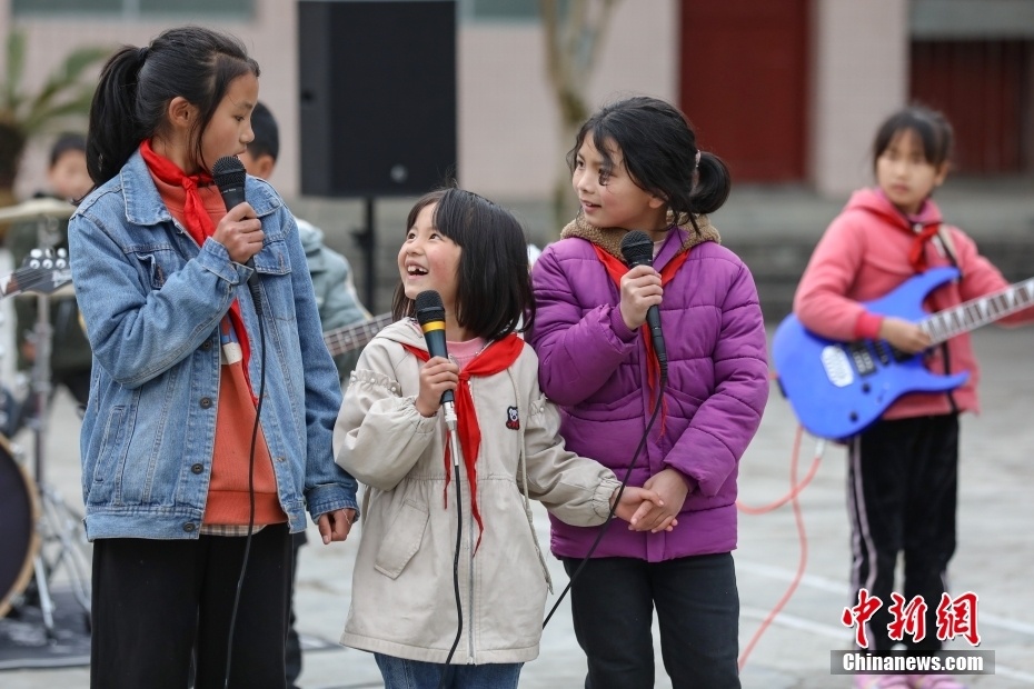 位于大山深处的贵州省遵义市凤冈县新建镇大水完小,有一支由8名不同年级学生组成的“打火石”乐队。“打火石”乐队是大水完小两位音乐专业特岗教师在2021年进行“双减”工作探索中,为丰富学生课后服务活动而组建的摇滚乐队。乐队的成员利用每天大课间以及课后服务时间学习各类乐理知识和乐器使用技巧。目前,在教师的指导训练下,成员们的演奏和演唱能力越来越成熟。指导教师樊彪说,希望孩子们能像打火石一样,通过音乐点燃热情,演绎精彩人生。图为3月24日,“打火石”乐队成员在表演节目。 中新社记者 瞿宏伦 摄