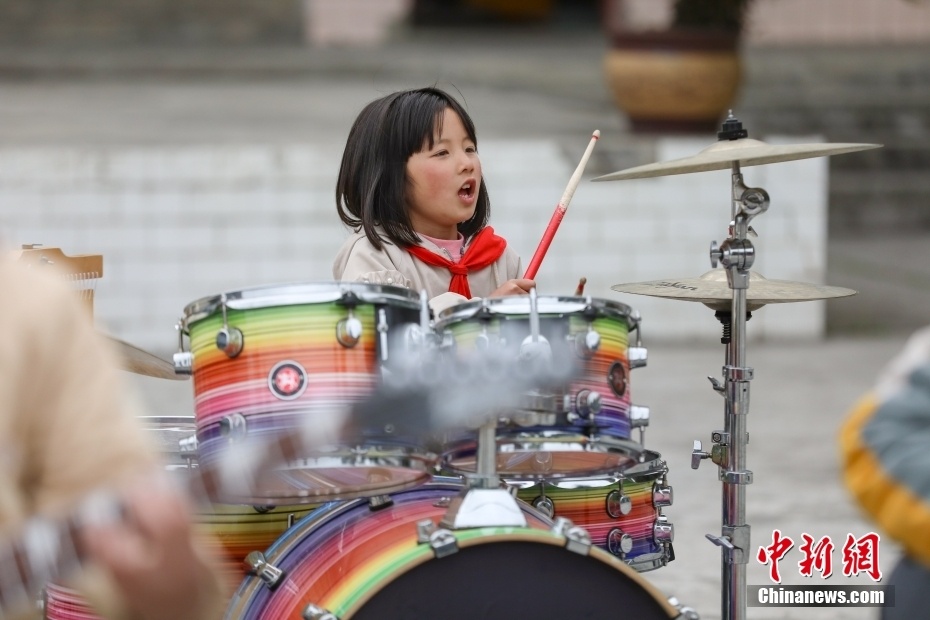 位于大山深处的贵州省遵义市凤冈县新建镇大水完小,有一支由8名不同年级学生组成的“打火石”乐队。“打火石”乐队是大水完小两位音乐专业特岗教师在2021年进行“双减”工作探索中,为丰富学生课后服务活动而组建的摇滚乐队。乐队的成员利用每天大课间以及课后服务时间学习各类乐理知识和乐器使用技巧。目前,在教师的指导训练下,成员们的演奏和演唱能力越来越成熟。指导教师樊彪说,希望孩子们能像打火石一样,通过音乐点燃热情,演绎精彩人生。图为3月24日,“打火石”乐队架子鼓手杨雪怡在表演中。 中新社记者 瞿宏伦 摄