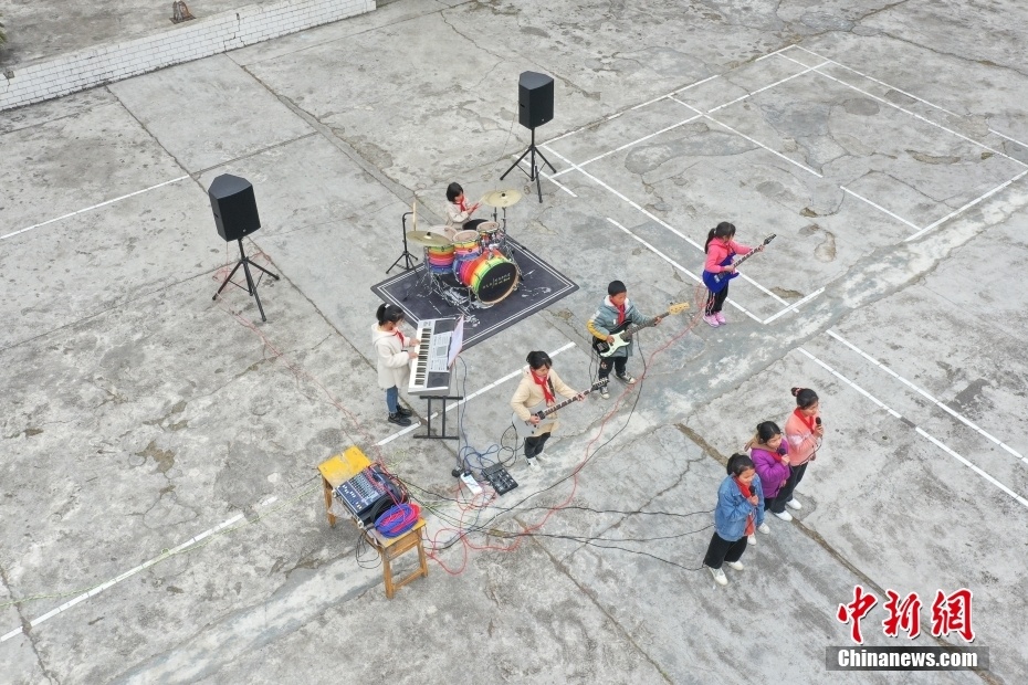 位于大山深处的贵州省遵义市凤冈县新建镇大水完小,有一支由8名不同年级学生组成的“打火石”乐队。“打火石”乐队是大水完小两位音乐专业特岗教师在2021年进行“双减”工作探索中,为丰富学生课后服务活动而组建的摇滚乐队。乐队的成员利用每天大课间以及课后服务时间学习各类乐理知识和乐器使用技巧。目前,在教师的指导训练下,成员们的演奏和演唱能力越来越成熟。指导教师樊彪说,希望孩子们能像打火石一样,通过音乐点燃热情,演绎精彩人生。图为3月24日,“打火石”乐队在学校操场表演节目。(无人机照片) 中新社记者 瞿宏伦 摄