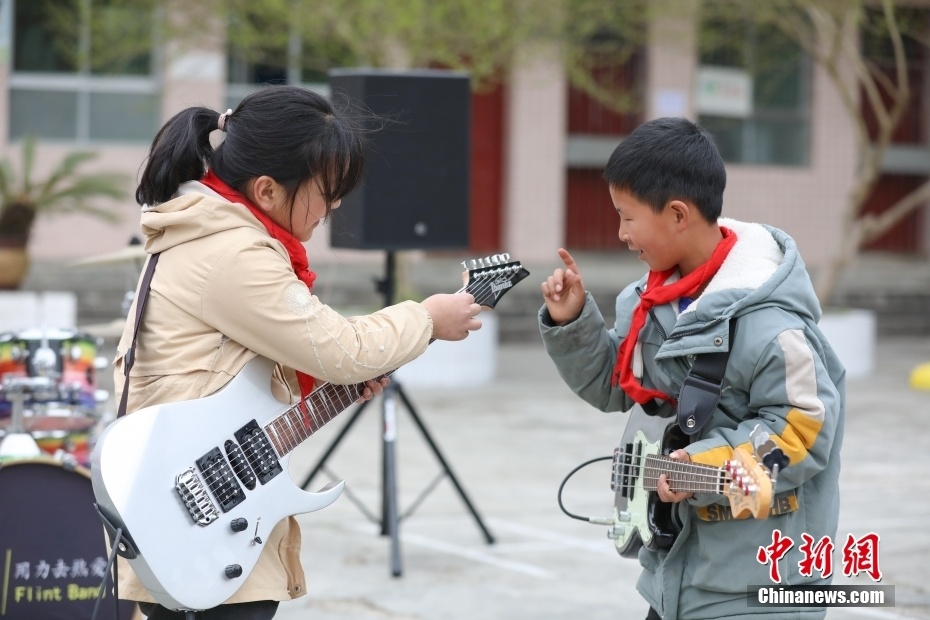 位于大山深处的贵州省遵义市凤冈县新建镇大水完小,有一支由8名不同年级学生组成的“打火石”乐队。“打火石”乐队是大水完小两位音乐专业特岗教师在2021年进行“双减”工作探索中,为丰富学生课后服务活动而组建的摇滚乐队。乐队的成员利用每天大课间以及课后服务时间学习各类乐理知识和乐器使用技巧。目前,在教师的指导训练下,成员们的演奏和演唱能力越来越成熟。指导教师樊彪说,希望孩子们能像打火石一样,通过音乐点燃热情,演绎精彩人生。图为3月24日,“打火石”乐队吉他手桂书语(左)和贝斯手汪正运在互识乐器。 中新社记者 瞿宏伦 摄