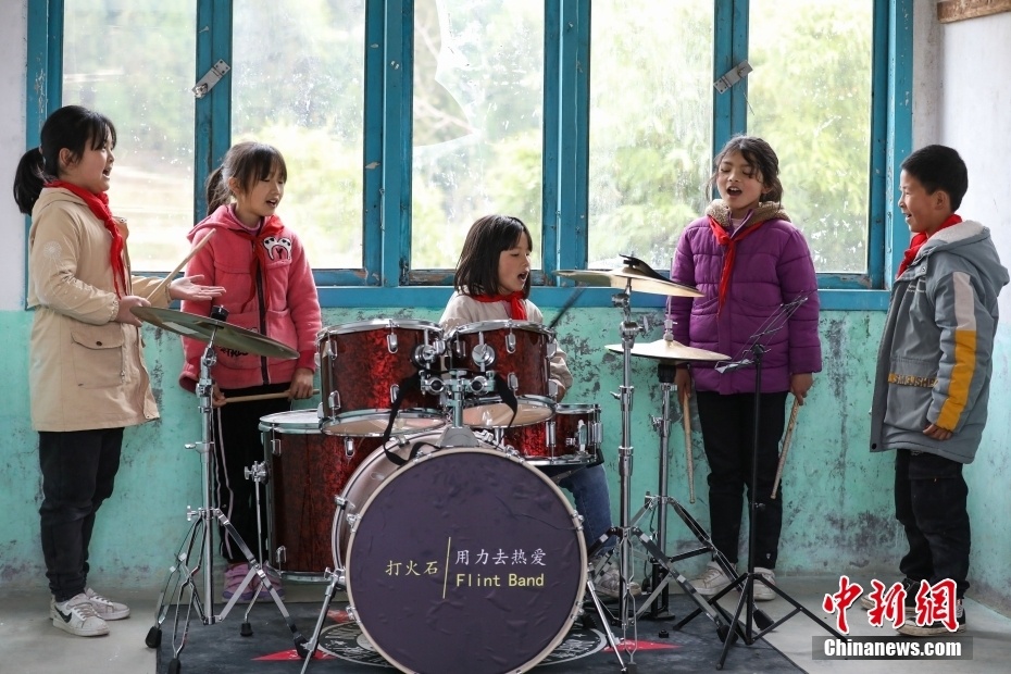 位于大山深处的贵州省遵义市凤冈县新建镇大水完小,有一支由8名不同年级学生组成的“打火石”乐队。“打火石”乐队是大水完小两位音乐专业特岗教师在2021年进行“双减”工作探索中,为丰富学生课后服务活动而组建的摇滚乐队。乐队的成员利用每天大课间以及课后服务时间学习各类乐理知识和乐器使用技巧。目前,在教师的指导训练下,成员们的演奏和演唱能力越来越成熟。指导教师樊彪说,希望孩子们能像打火石一样,通过音乐点燃热情,演绎精彩人生。图为3月24日,“打火石”乐队的成员大课间在排练室练习。 中新社记者 瞿宏伦 摄