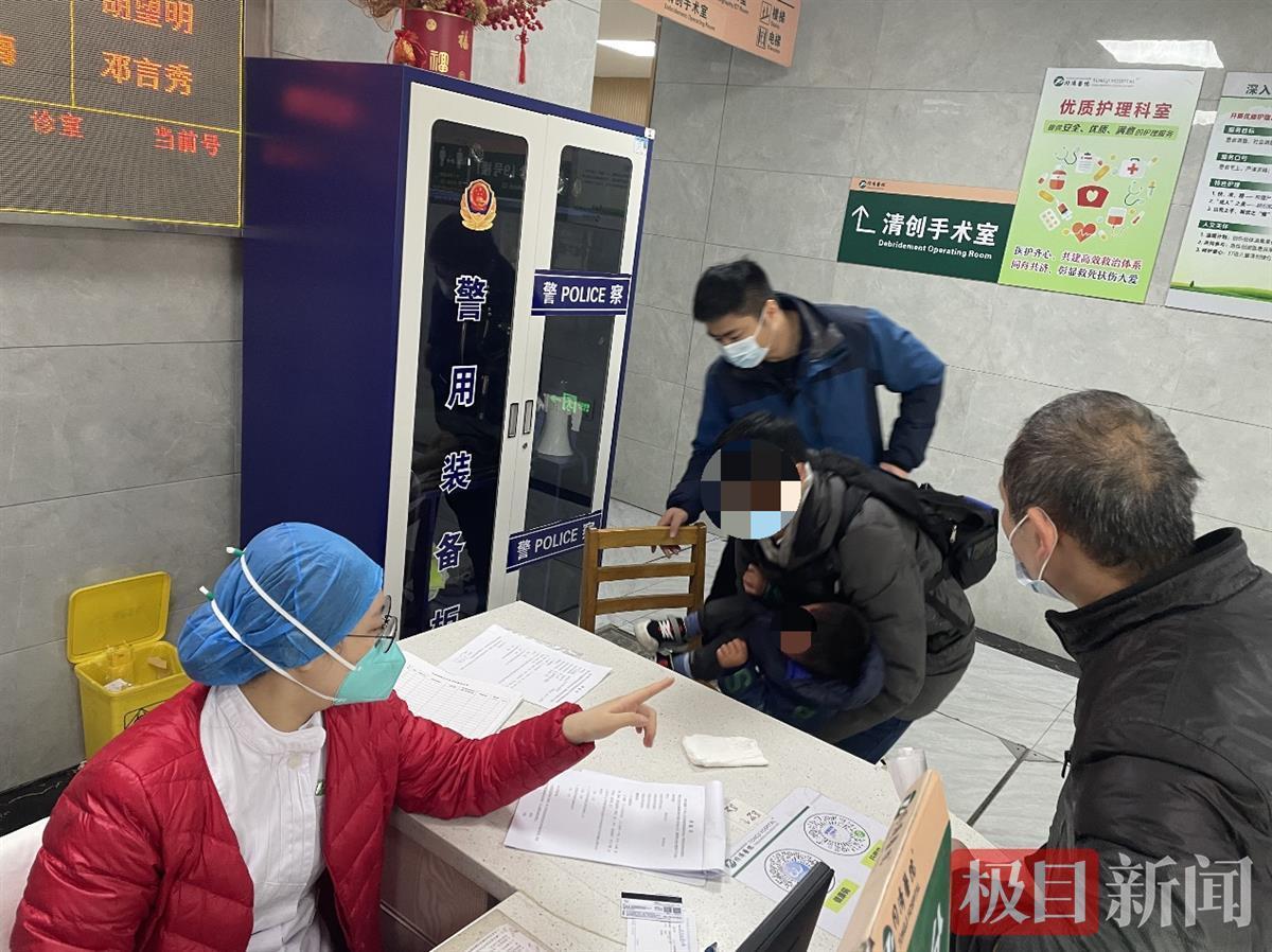 只见男子不停地在哭泣,右手用手巾捂着男孩的头部,男孩脸部还残留着血迹。后来得知,小孩因摔伤头部血流不止。