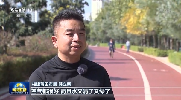 福建莆田市民 韩立新:空气都很好,而且水又清了又绿了,而且绿化都很好,现在我们站在木兰溪跑道上面,都不敢想象会变成这么美好。
