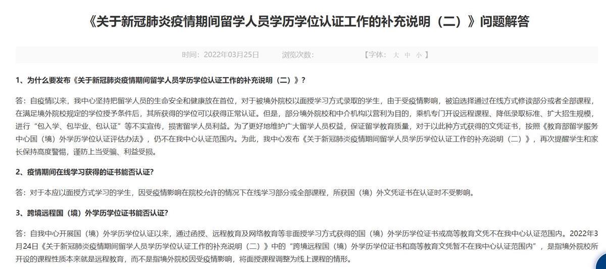 3月25日,该网站针对《说明(二)》再次发布问题解答,解答中表明:由于受疫情影响,被迫选择通过在线方式修读部分或者全部课程,在满足境外院校规定的学位授予条件后,其所获得的学位可以获得正常认证。但是,部分境外院校和中介机构以营利为目的,乘机专门开设远程课程、降低录取标准、扩大招生规模,进行“包入学、包毕业、包认证”等不实宣传,损害留学人员利益。为了更好地维护广大留学人员权益,保证留学教育质量,对于以此种方式获得的文凭证书,按照《教育部留学服务中心国(境)外学历学位认证评估办法》,仍不在教育部留学服务中心认证范围内。
