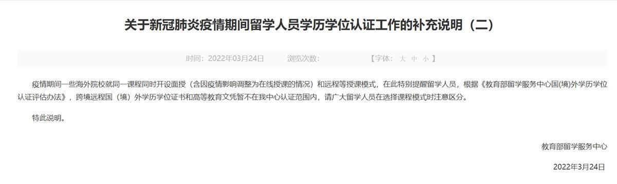 3月24日,教育部留学服务中心网站发布了《关于新冠肺炎疫情期间留学人员学历学位认证工作的补充说明(二)》。