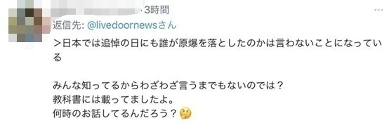 普京抨击日本的言论在日本网络上引发争论,有部分日本网民不认同普京的说法,认为“二战时美国投下原子弹”是常识:“普京说,‘在追悼日时,日本不点名是谁扔下了原子弹’,我认为难道不是因为大家都知道所以不特意提及吗?在教科书中写了(是谁投了原子弹)。普京在说什么时候的事?”