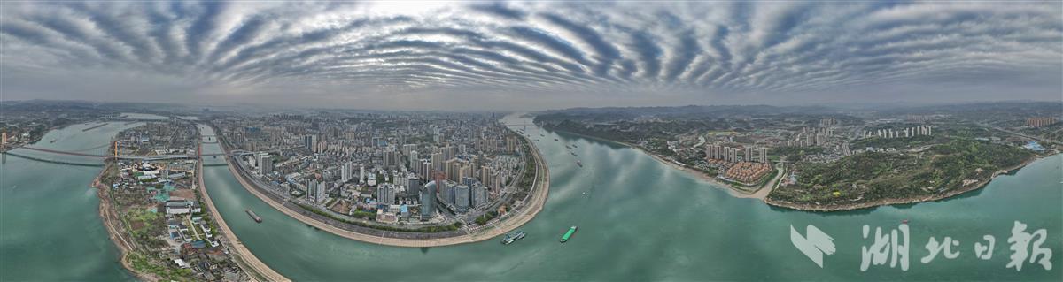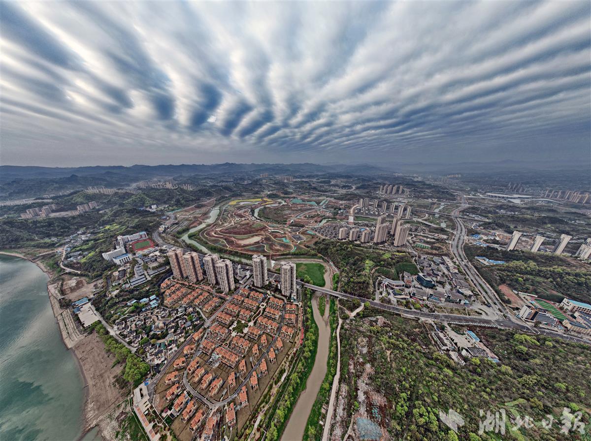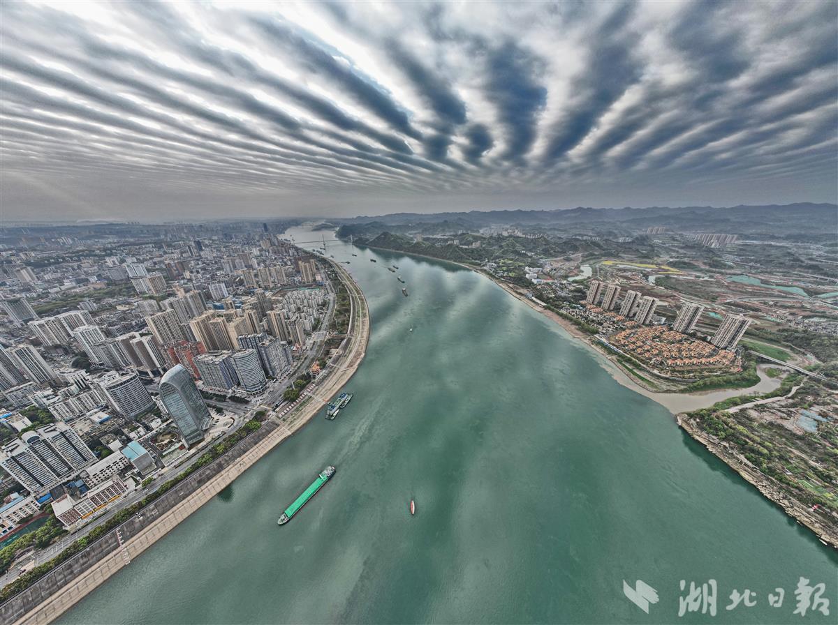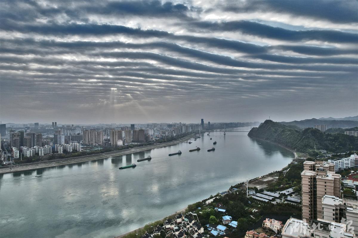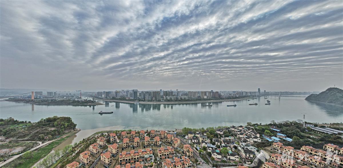 3月27日清晨,宜昌上空出现了美丽壮观的条状云彩景观,条状云呈散射状有规律地分布在城市上空,如同条条色彩分明的直线分布在城市上空。据资料显示,出现条状云的原因是主要在3000至5000米左右的空中有较为稳定而湿润空气发生波动所形成。云有块状、片状等,云体有时分散孤立,有时聚集成群、成行,好像田垄或波浪。薄的高积云稳定少变,一般预示天晴;厚的高积云如继续增厚,预示可能有弱降雨水出现。(湖北日报全媒记者刘曙松摄)