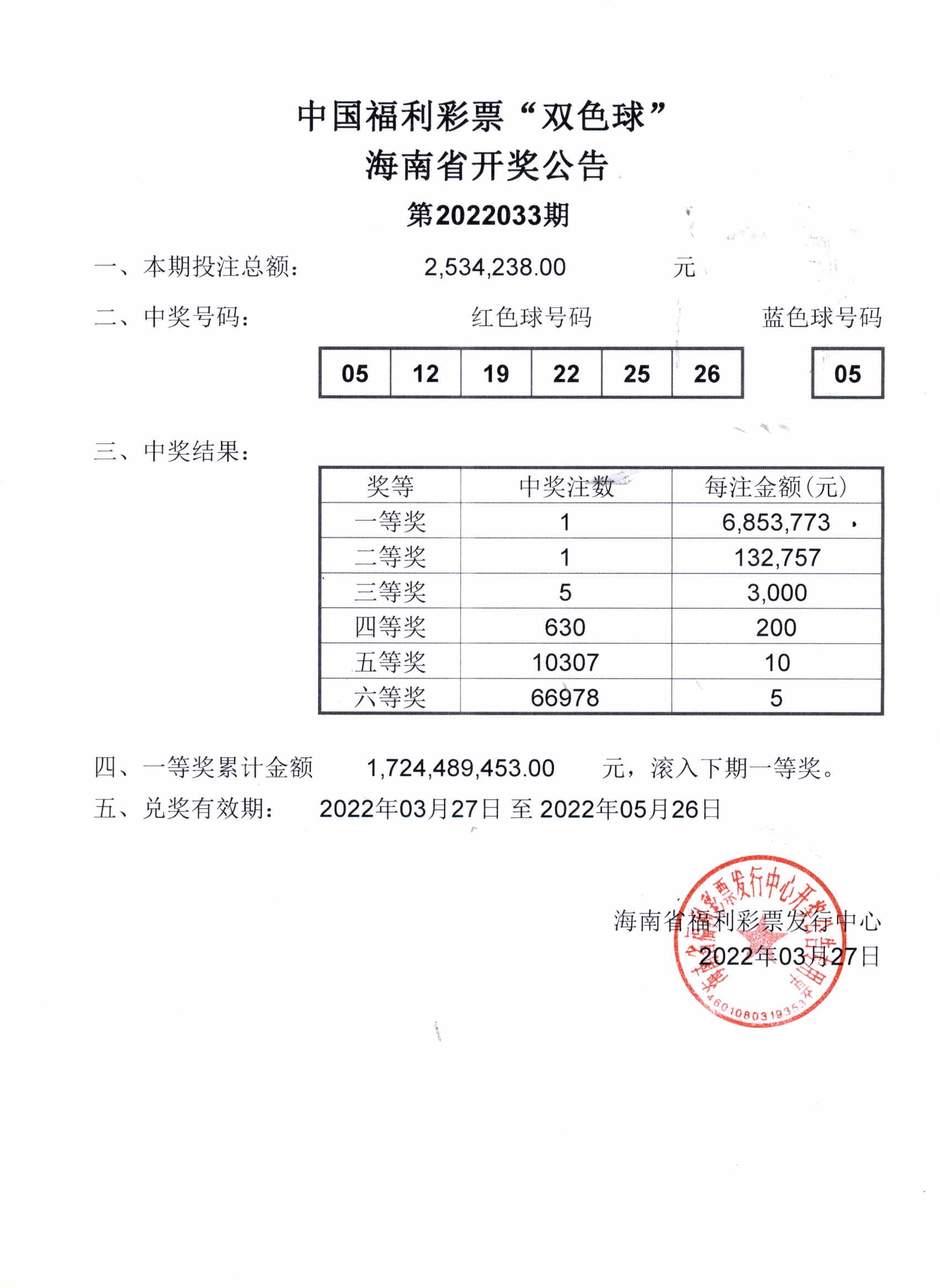 3月27日晚,双色球22033期开奖号码公布,中奖号码为红球:05、12、19、22、25、26,蓝球:05。全国共中出一等奖11注,其中海南1注、河北2注、浙江1注、山东1注、湖北1注、河南2注、四川1注、贵州1注、云南1注,单注奖金685万元。