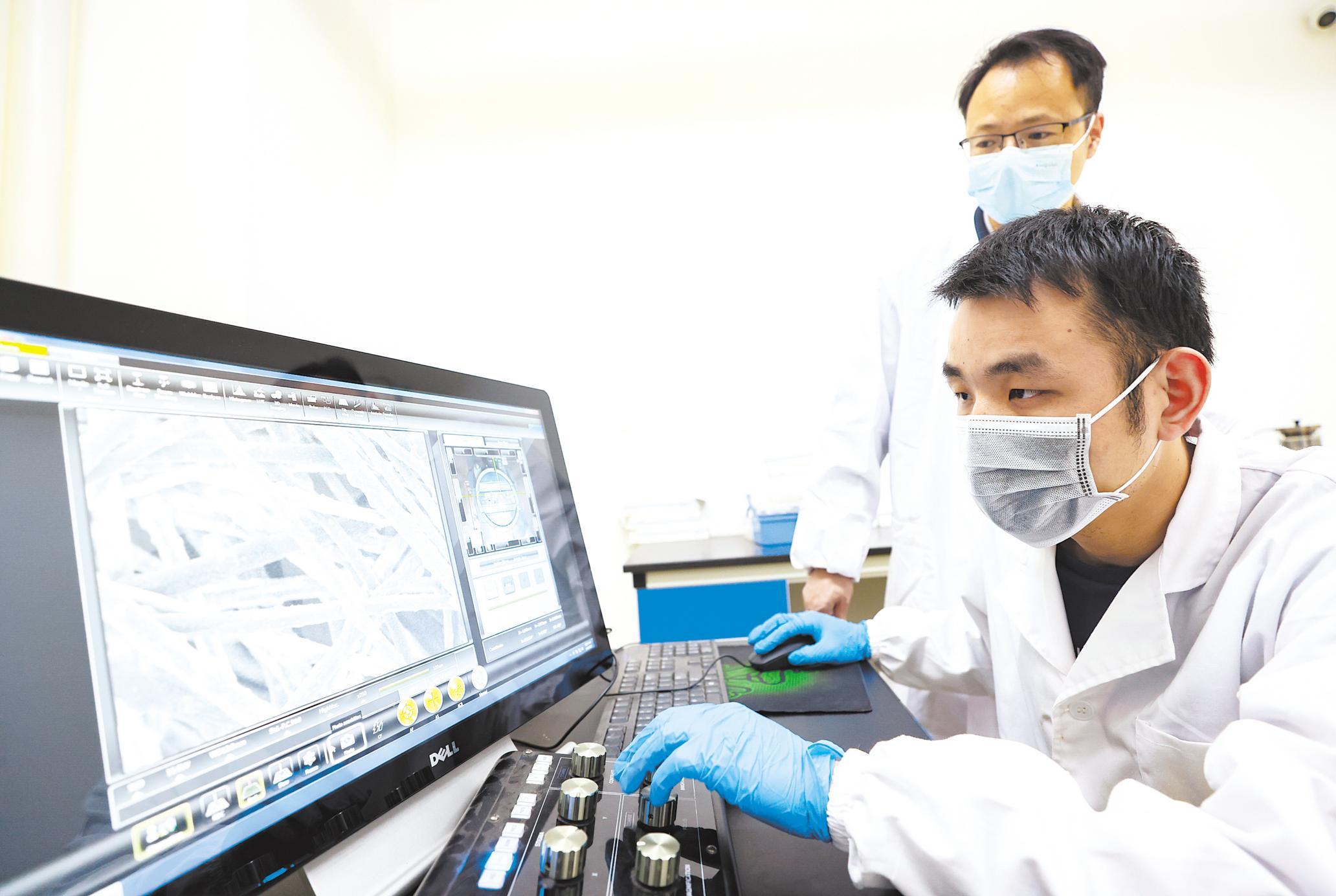 3月18日,拓盈公司研发团队在电子显微镜下检测新材料。 (湖北日报全媒记者 柯皓 摄)