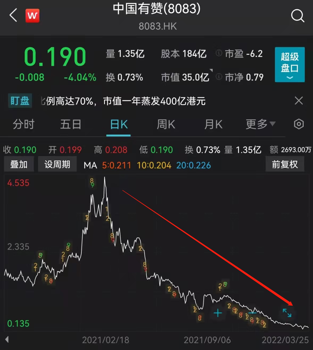 持续亏损的同时,股价也是一路走低。2021年2月后,有赞股价不断下跌,截至2022年3月25日,有赞收报0.19港元/股,市值仅为35亿港元元,较最高时跌去约95%。