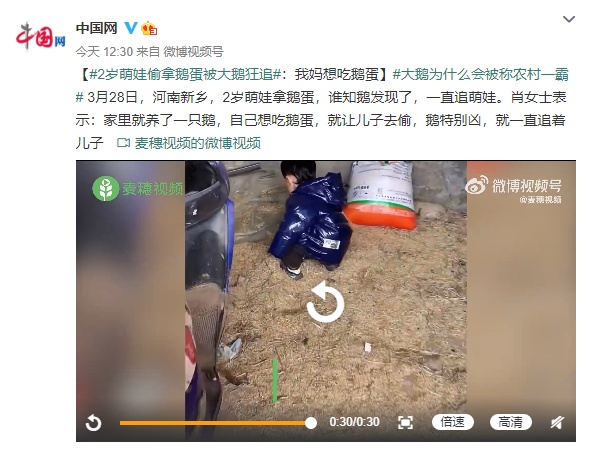 2岁萌娃偷鹅蛋被大鹅狂追:“是我妈想吃鹅蛋”