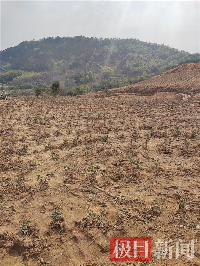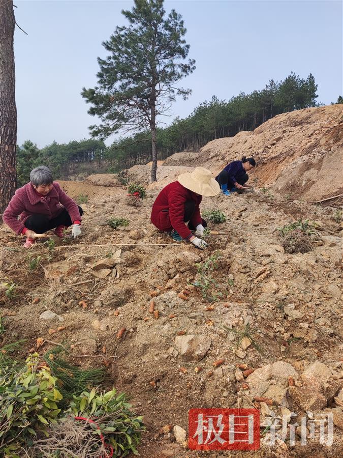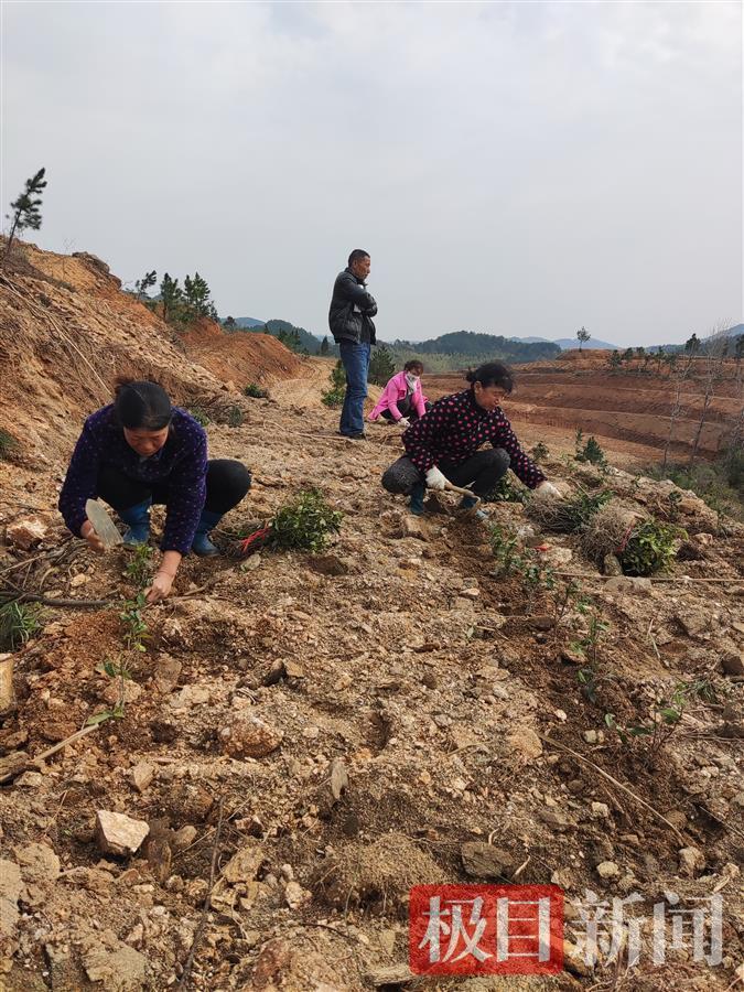 28日,湖北省团风县贾庙乡水晶坳村的一座山头一派繁忙,15位村民在刚刚开垦的山坡上种白茶苗。