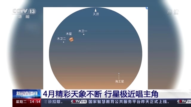 4月13日凌晨,木星和海王星也将在东南方低空中达到极近距离,两者之间的距离看上去只有月亮视直径的五分之一,下一次木星和海王星如此近距离出现在夜空中要等到76年后。