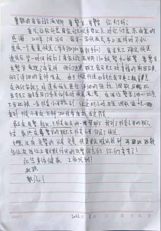 长江日报大武汉客户端3月29日讯 “如果没有民警的认真负责,我的快递肯定找不到了,你们辛苦了。”29日,武汉市公安局江汉分局唐家墩派出所收到一封手写的感谢信,寄信人是一名快递小哥。信中,字里行间包含着当事人对民警的深深感激之情。