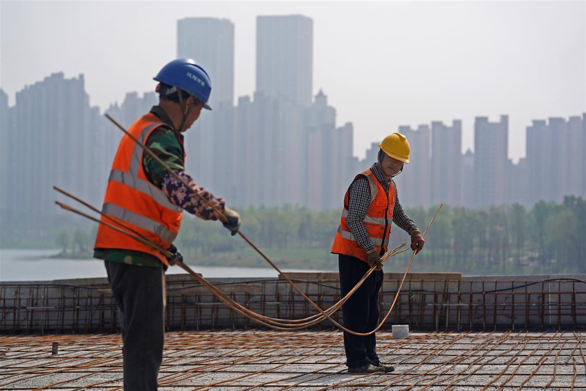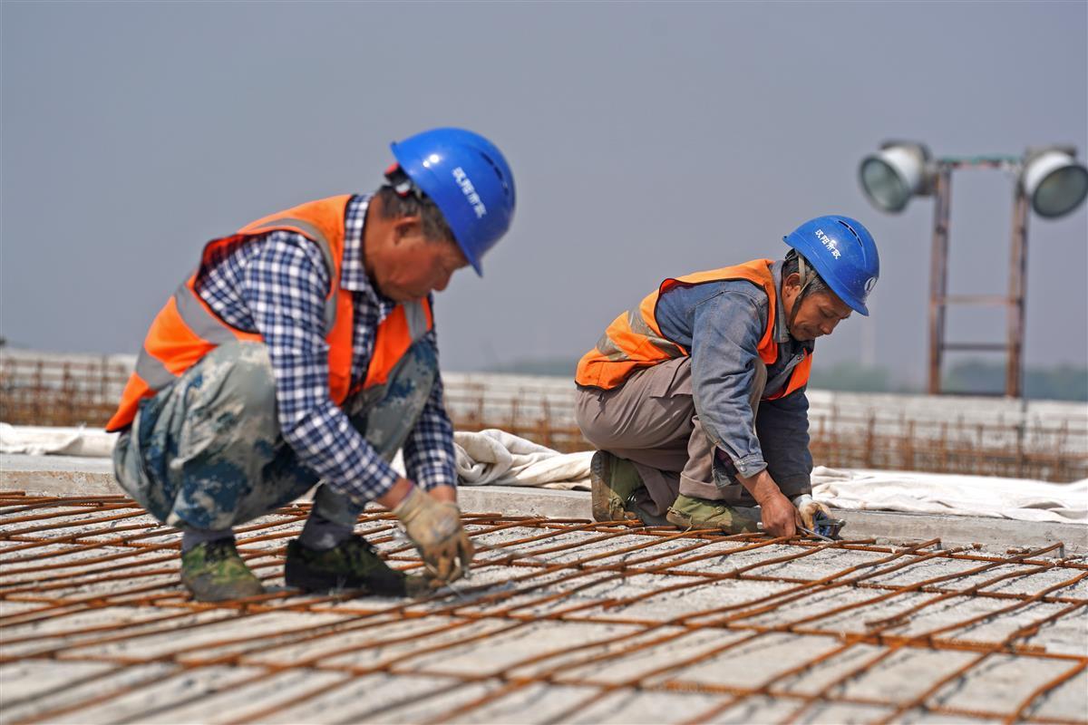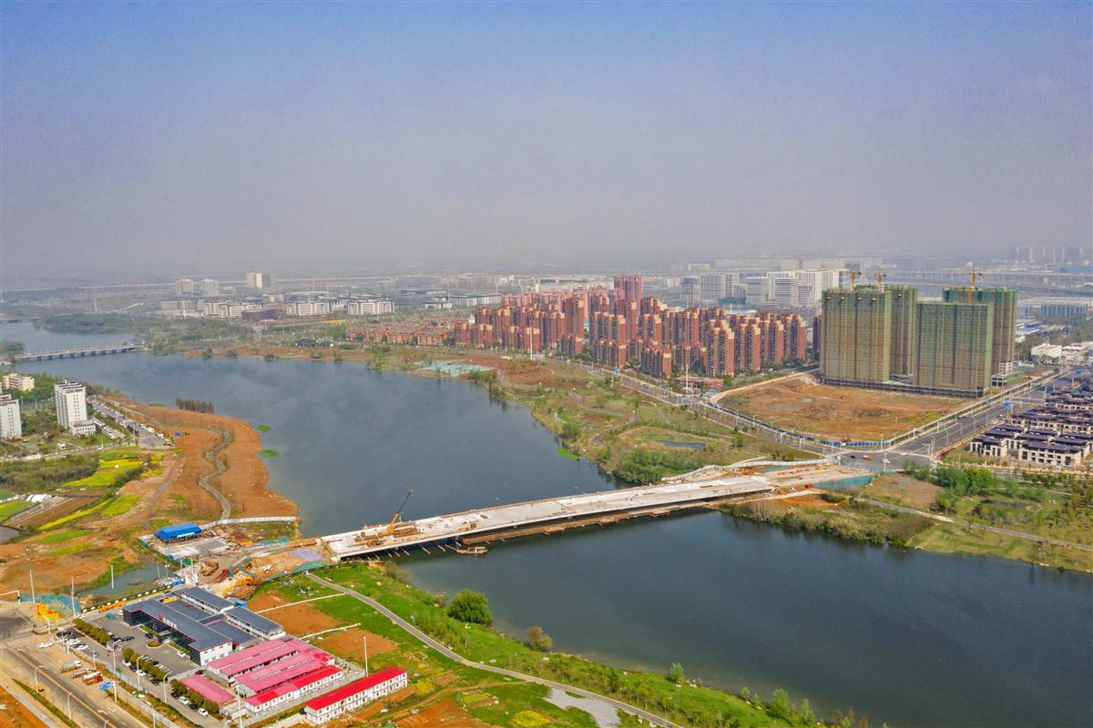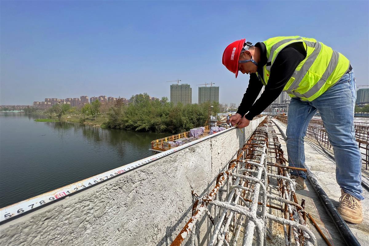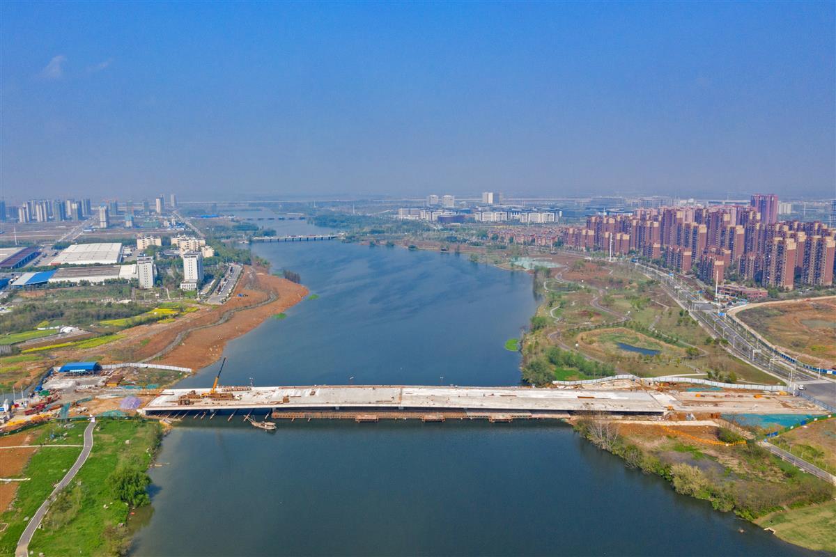 2022年3月28日,在武汉市临空港经济开发区(东西湖区)径河中游的径河五路跨河大桥施工现场,工人们正在加紧施工,目前大桥主体工程已经完成,正在进行桥面施工。据介绍,该桥北接径河五路与滨河北路交叉口,南接黄狮海东路与滨河南路交叉口,全长约350米,双向4车道。据介绍,径河是东西湖区境内最长的一条内河,全长约10公里,是该区东西相连的重要河道。为进一步改善交通环境,联通临空港新城与网安基地,打通径河两岸交通瓶颈,带动区域经济发展,今年内即将有径河五路跨河大桥、共享路跨径河大桥两座大桥建成通车,届时径河之上将一共横跨6座桥梁。(湖北日报全媒记者 倪娜 通讯员 叶宗云 徐一帆 摄)