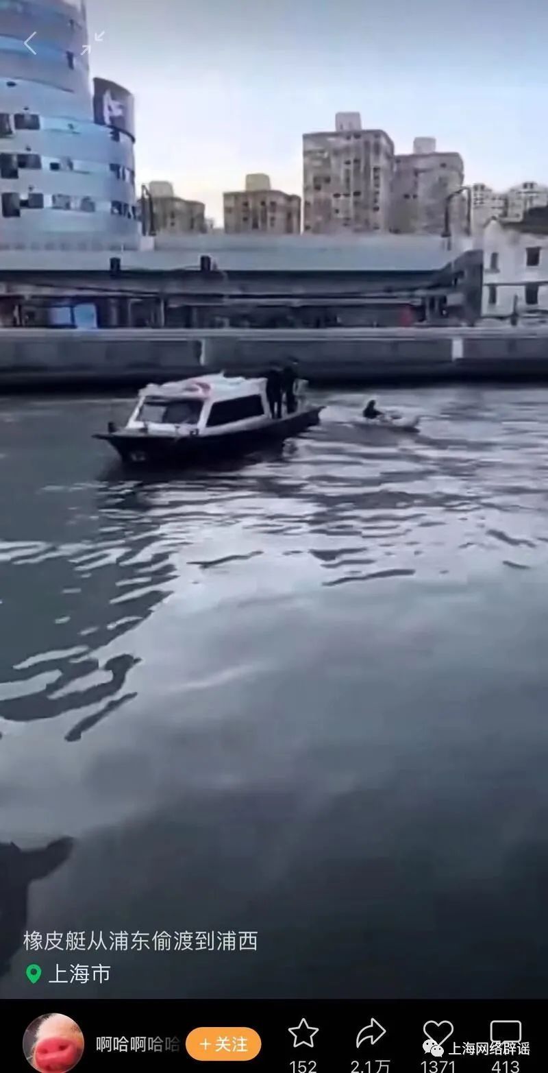 根据这段视频的画面内容,网友传出多种说法,有的称“男子从苏州偷渡到上海”,有的称“男子乘坐橡皮艇,从浦东偷渡到浦西”……