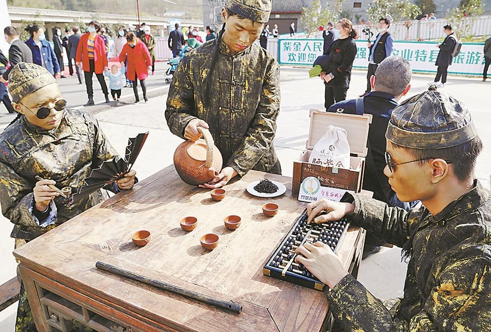 “我们举办活动是为了进一步弘扬紫金茶文化、振兴紫金茶产业,激发全镇上下热爱家乡、建设家乡的热情,吸引更多人到紫金游山玩水,投资兴业。”紫金镇镇长朱正丰说,目前,全镇形成了“一心二带三区”的发展格局,即农特产品交易、物流中心,241国道生态观光带、紫百路红色旅游带,观音堂神话西游体验区、官坊军民融合康养区和福山茶旅休闲区,其中茶叶种植面积达3.8万亩,茶叶系列产值3.2亿元,茶产业成为推动乡村振兴的支柱产业和特色品牌。
