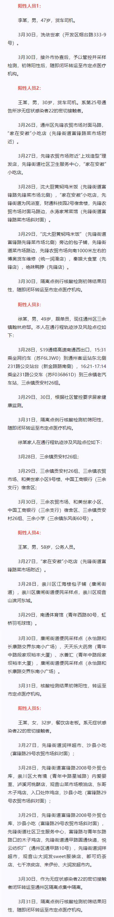 3月30日21时至31日8时,江苏省南通市在交通查验服务点重点人员筛查、居家隔离人员筛查、重点人群筛查中发现3人核酸检测初筛阳性,在集中隔离人员例行检测中发现2人核酸检测初筛阳性,5人均已闭环转运至市定点医疗机构,流调溯源、密接排查、人员管控、社会面防控等处置工作正在积极开展中,在南通市个人行程轨迹涉及风险点位如下: