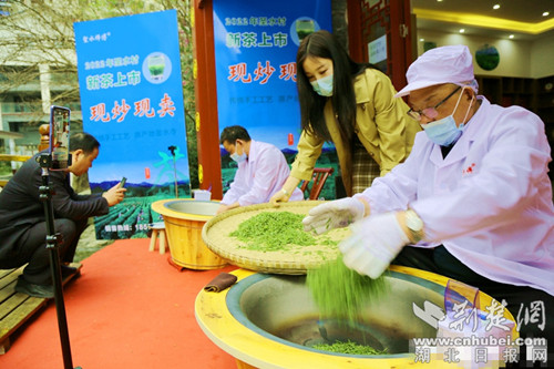 近期,气温升高、间或降雨,竹山县低山、库周茶山陆续开园,一批茶商、茶农抢抓时机采摘、加工新茶,并利用网络电商平台售卖,直播更是方便客户直观了解茶叶嫩芽品质和手工炒制全过程。3月29日到3月31日,圣水村茶庄通过直播,累计吸引了3万多人上线观看,手工炒出的新茶供不应求。