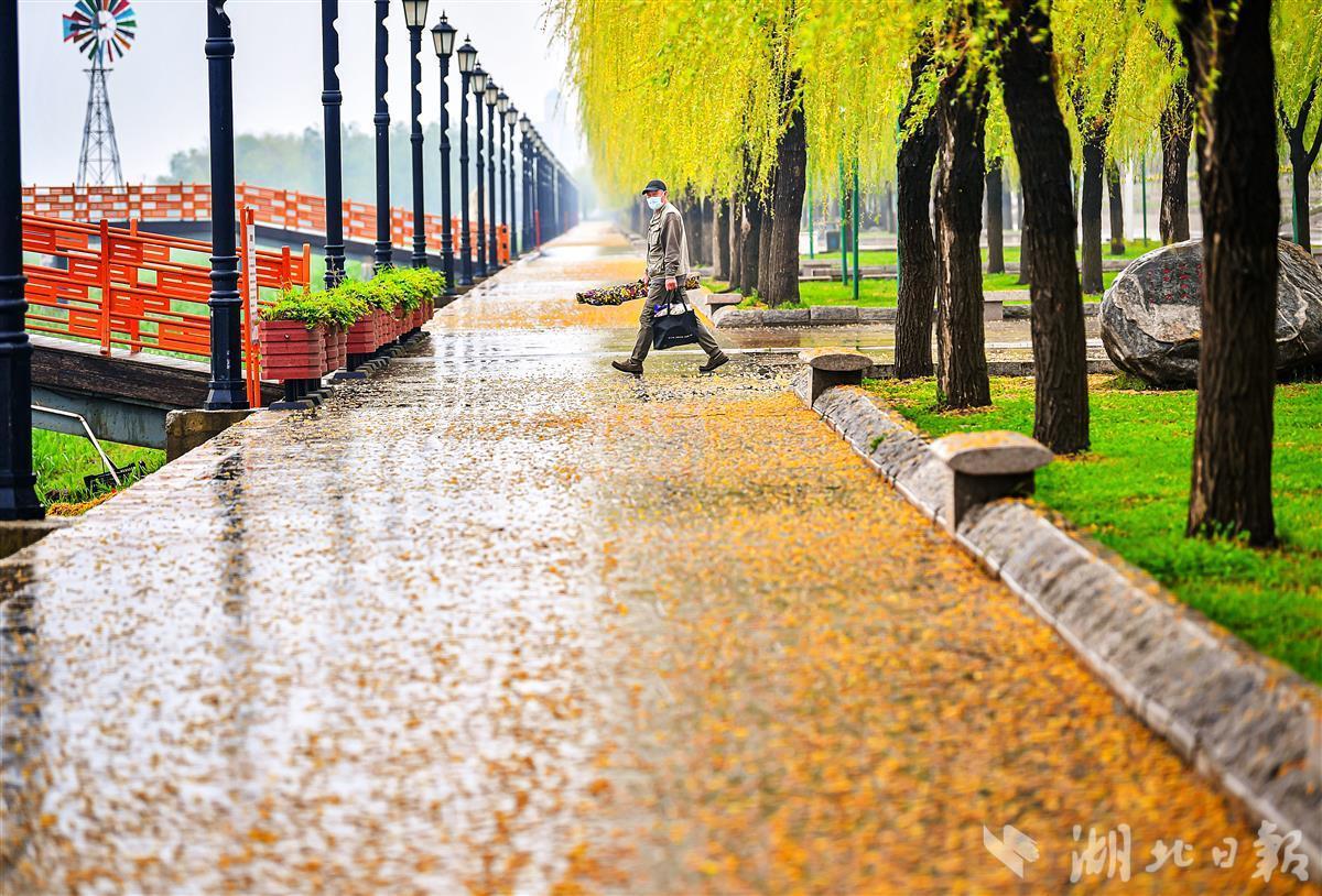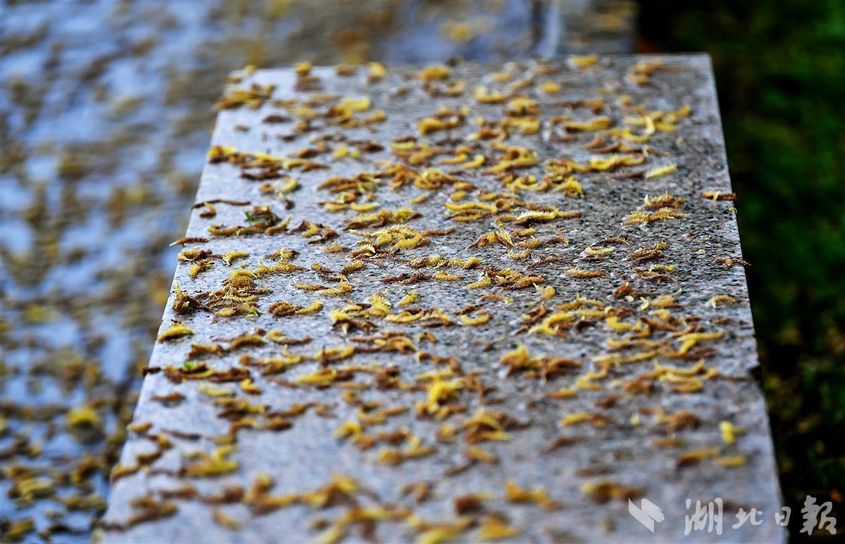 因柳树花被连日两天的风雨吹打,开始纷纷飘落,落满一地。今日武汉天气:小雨转多云,温度 10 至17℃,东北风4-5级转东北风3-4级。(湖北日报全媒记者 朱熙勇 摄)