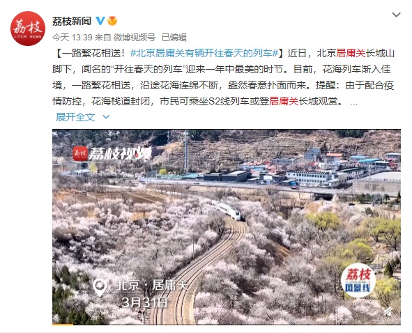 近日,北京居庸关长城脚下,闻名的“开往春天的列车”迎来一年中最美的时节。目前,花海列车渐入佳境,一路繁花相送,沿途花海连绵不断,盎然春意扑面而来。提醒:为配合疫情防控,花海栈道封闭,市民可乘坐S2线列车或登居庸关长城观赏。