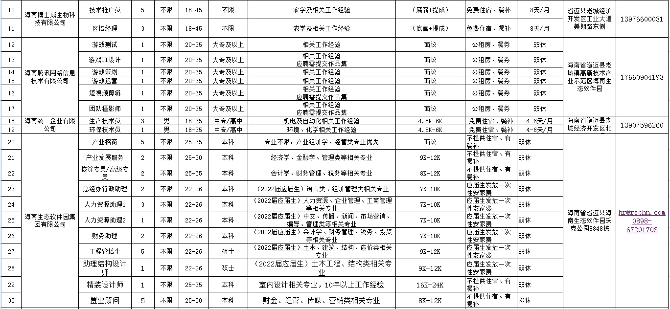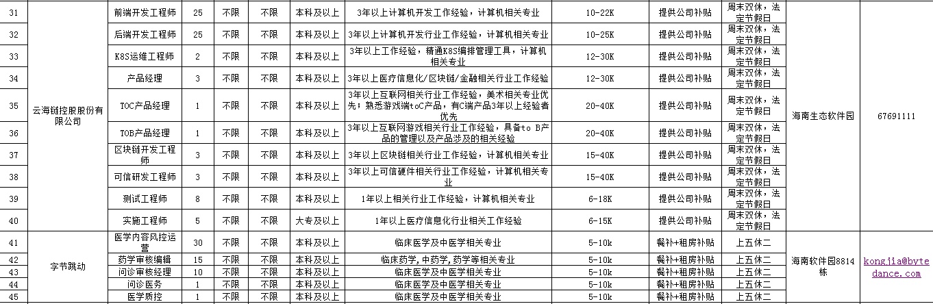 其中,iSchool微城未来学校提供24个教师岗位,包括5名英语老师、5名科学老师等;字节跳动公司提供57个岗位,包括医学内容风控运营30名、药学审核编辑15名、问诊审核经理10名等;云海链控股股份有限公司招聘76人,包括前端开发工程师25名;后端开发工程师25名;海南生态软件园集团有限公司招聘29人,包括产业招商5名;海南腾讯网络信息技术有限公司招聘6人;海南统一企业有限公司招聘4人;海南博士威生物科技有限公司招聘8人;海南海控特玻科技有限公司招聘7人;信义玻璃(海南)有限公司招聘100名汽车玻璃深加工操作工;海南顶津食品有限公司招聘7人。