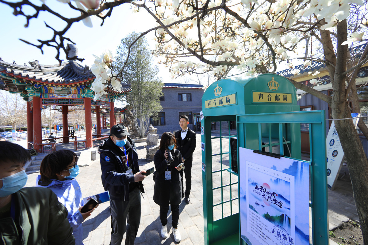 3月31日,在北京市八宝山殡仪馆,参观者观看新建的一座“声音邮局”,可以录制声音或写明信片寄出对先人的思念。 中国日报记者 朱兴鑫 摄