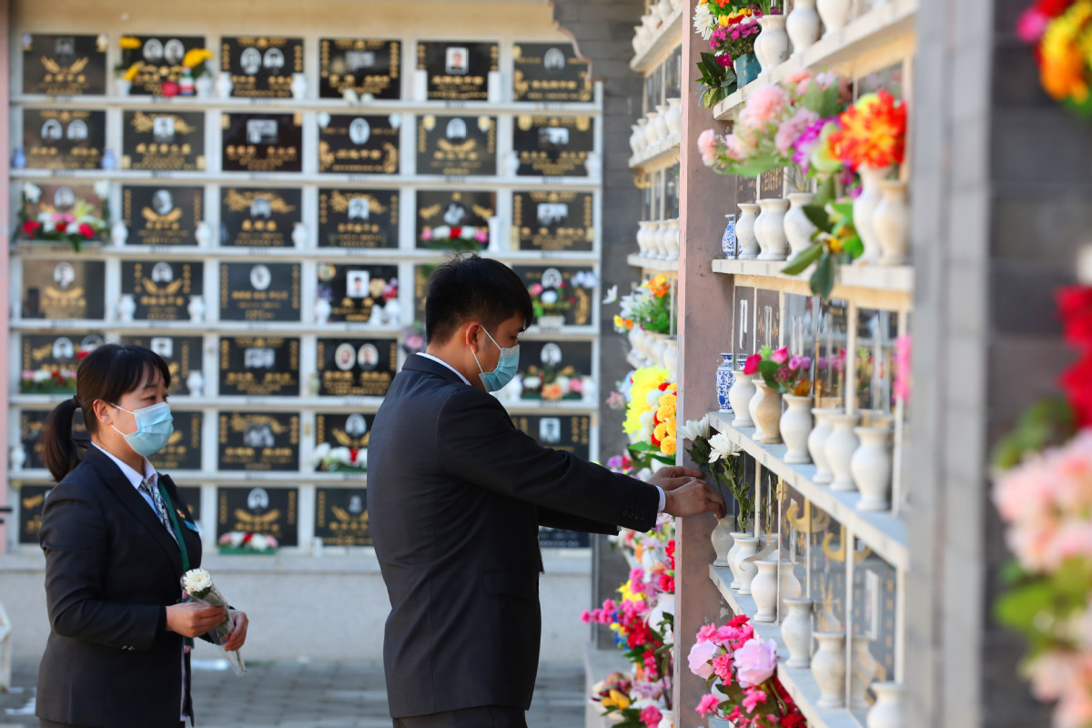 3月31日,在北京市八宝山革命公墓,工作人员为不能到现场祭扫的群众代为祭扫。中国日报记者 朱兴鑫 摄