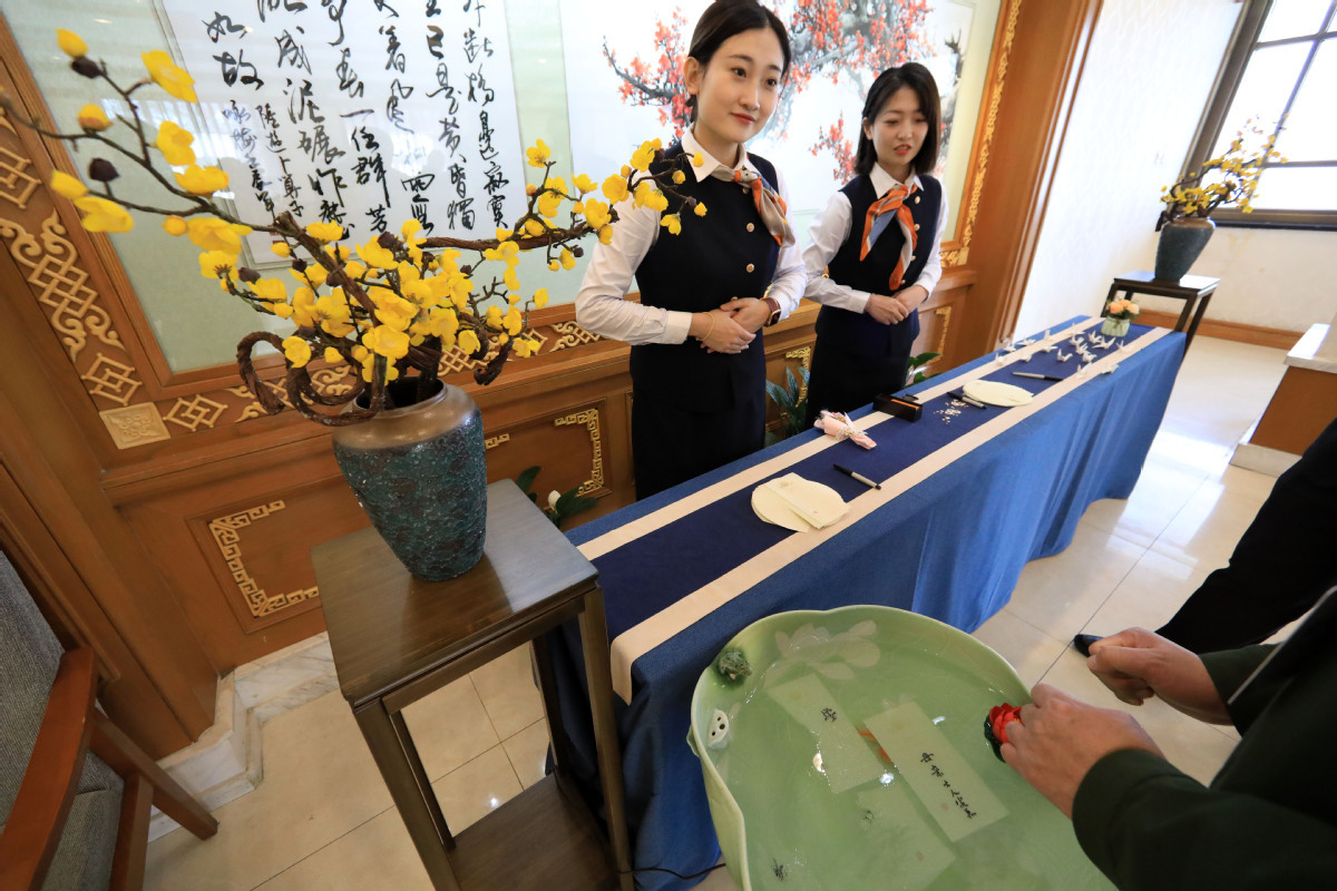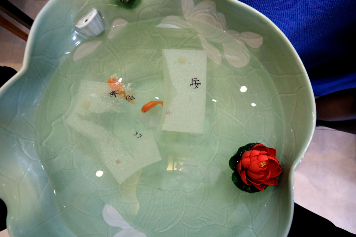 3月31日,在北京市八宝山殡仪馆,拍摄参观者写有寄语的信笺放入水中,遇水慢慢溶解。中国日报记者 朱兴鑫 摄