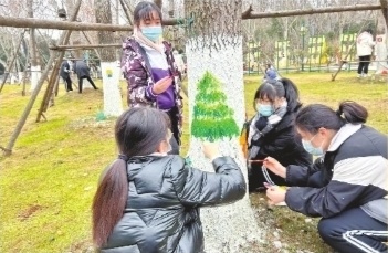今年1月,武汉市建港中学高二(11)班的52名学生来到琴台绿化广场开展实践活动。这里既是建港中学的校外研学基地,也是该校美术生的写生基地。这次的任务是通过自己的绘画美化公园广场环境。公园里的大小树木刚被整齐地刷了一层白石灰,工作人员介绍,树干穿上石灰水打造的白裙,能反射阳光,减少吸热,防止树干因昼夜温差过大而冻裂,还有杀菌和防虫的作用。“能在这个白裙上作画吗?”班主任左广成看到涂白突然来了“灵感”。经过一番沟通,工作人员拿来适合在树木上作画的涂料,同学们就开始创作了。