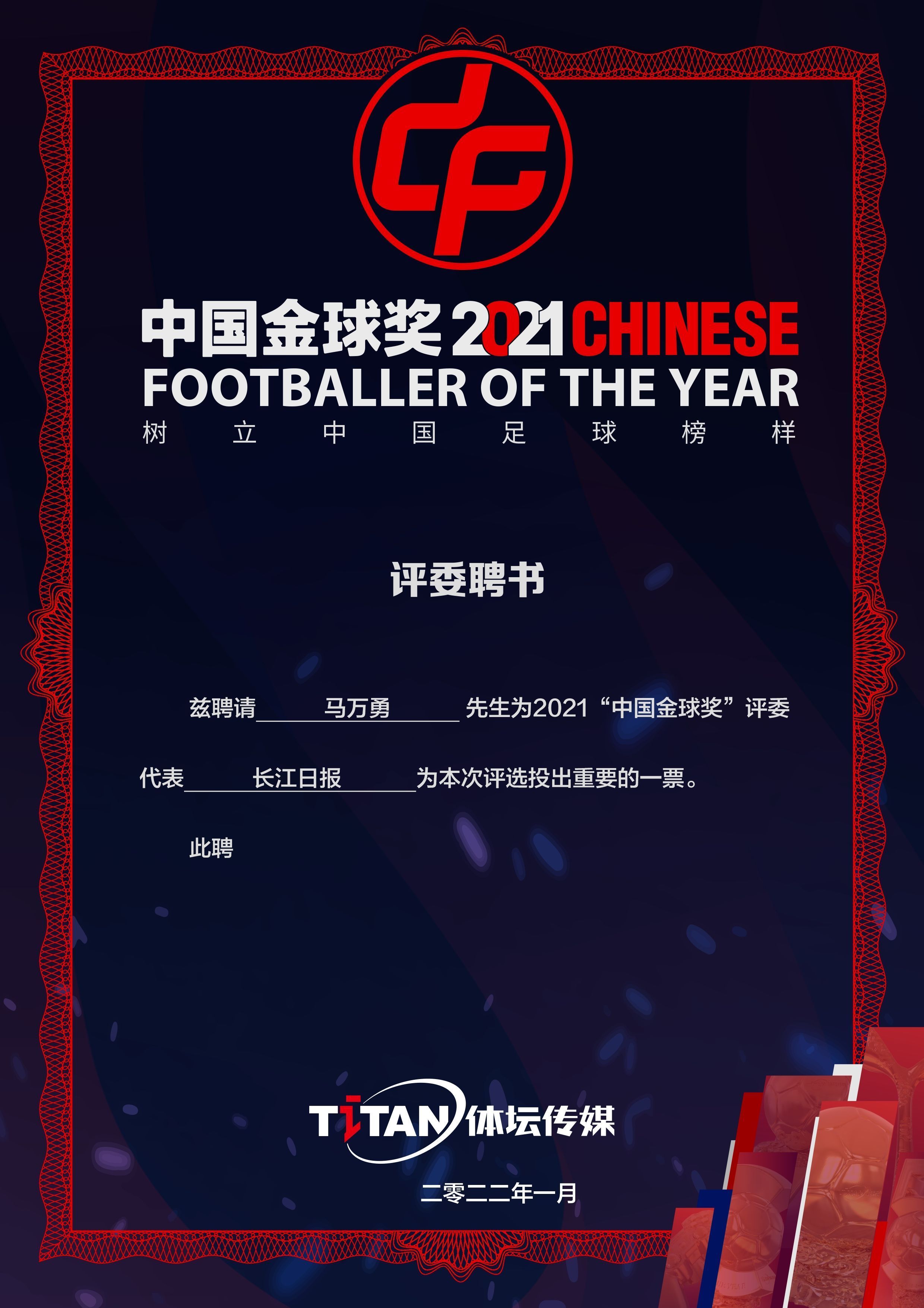 中国金球奖是由体坛传媒于2017年发起并主办,以中国足球人为评选对象,至今已举办五届。2021中国金球奖的评委团由119家权威国内体育媒体代表及国际媒体记者和特邀媒体人组成,《长江日报》记者马万勇连续第五年作为中国金球奖评委参加本次评选。