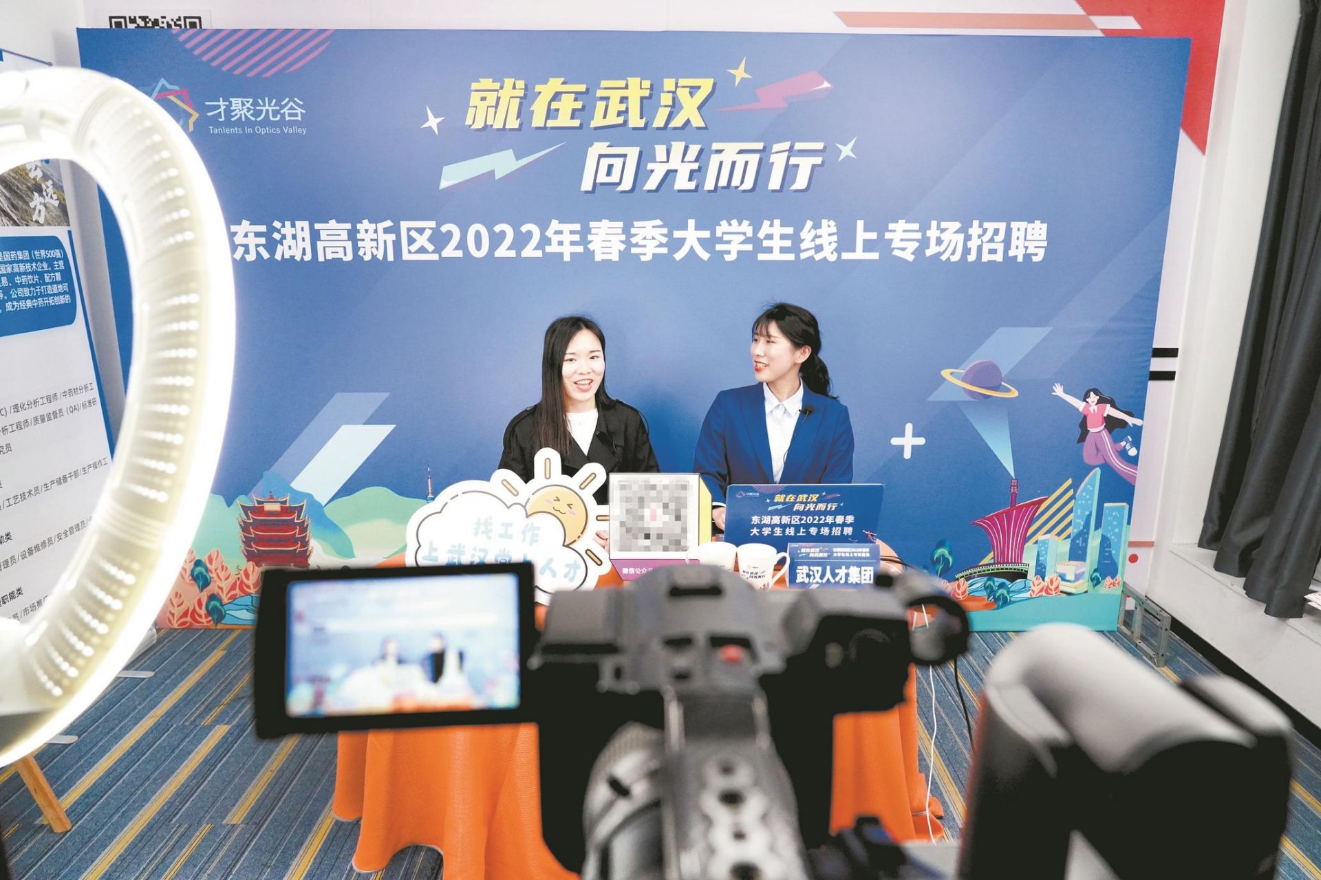 昨日下午,武汉东湖高新区举办大学生直播招聘活动。高德红外、中冶南方、国药中联、锐科激光4家光谷知名企业代表走进直播间,面向求职者花式介绍公司和招聘岗位。