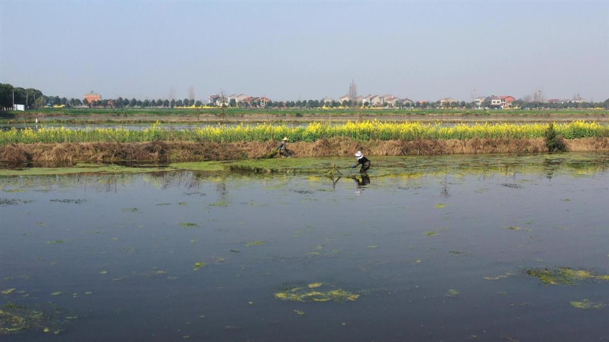 农场职工正在清理虾稻田水面青苔