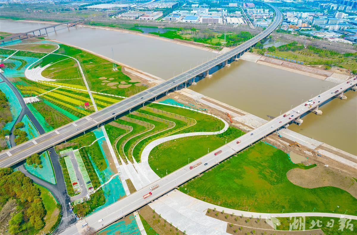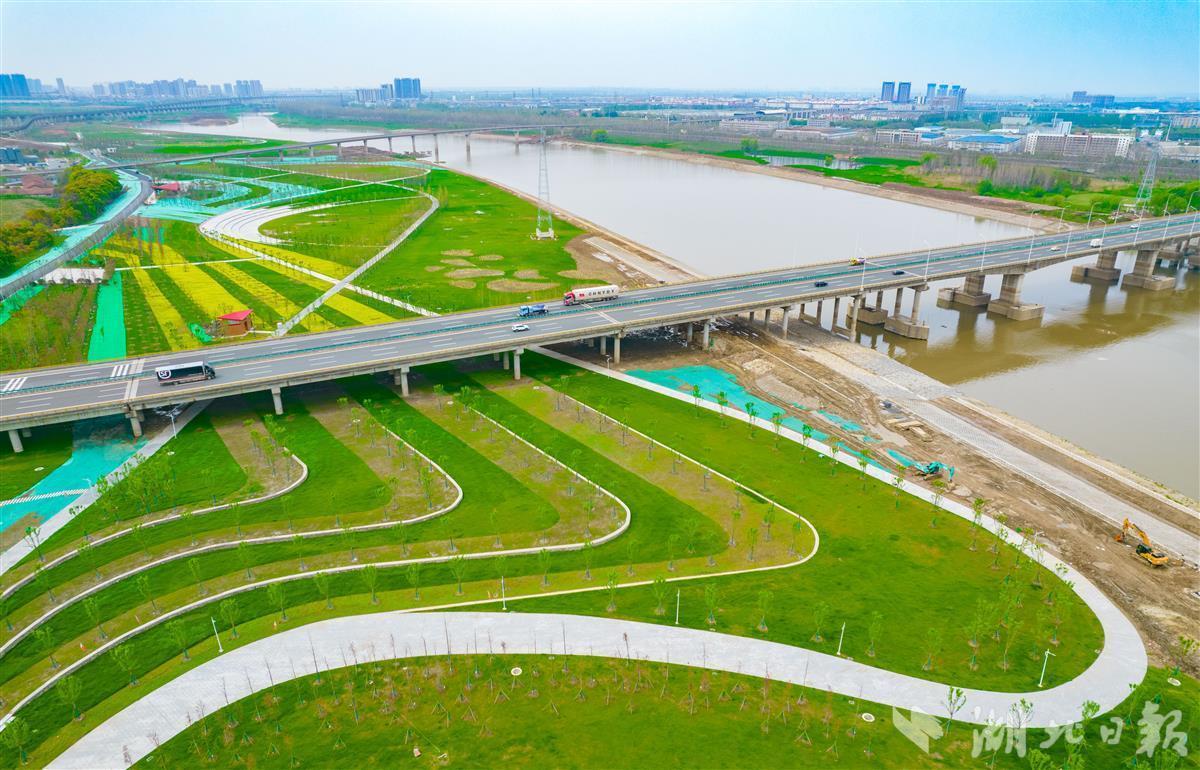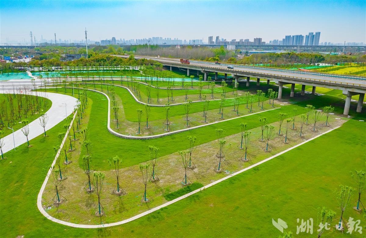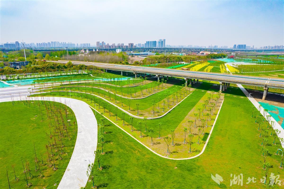 4月1日,武汉长江新区,府澴河出口河段综合整治工程(一期)滨江公园绿草如茵、油菜花盛开。