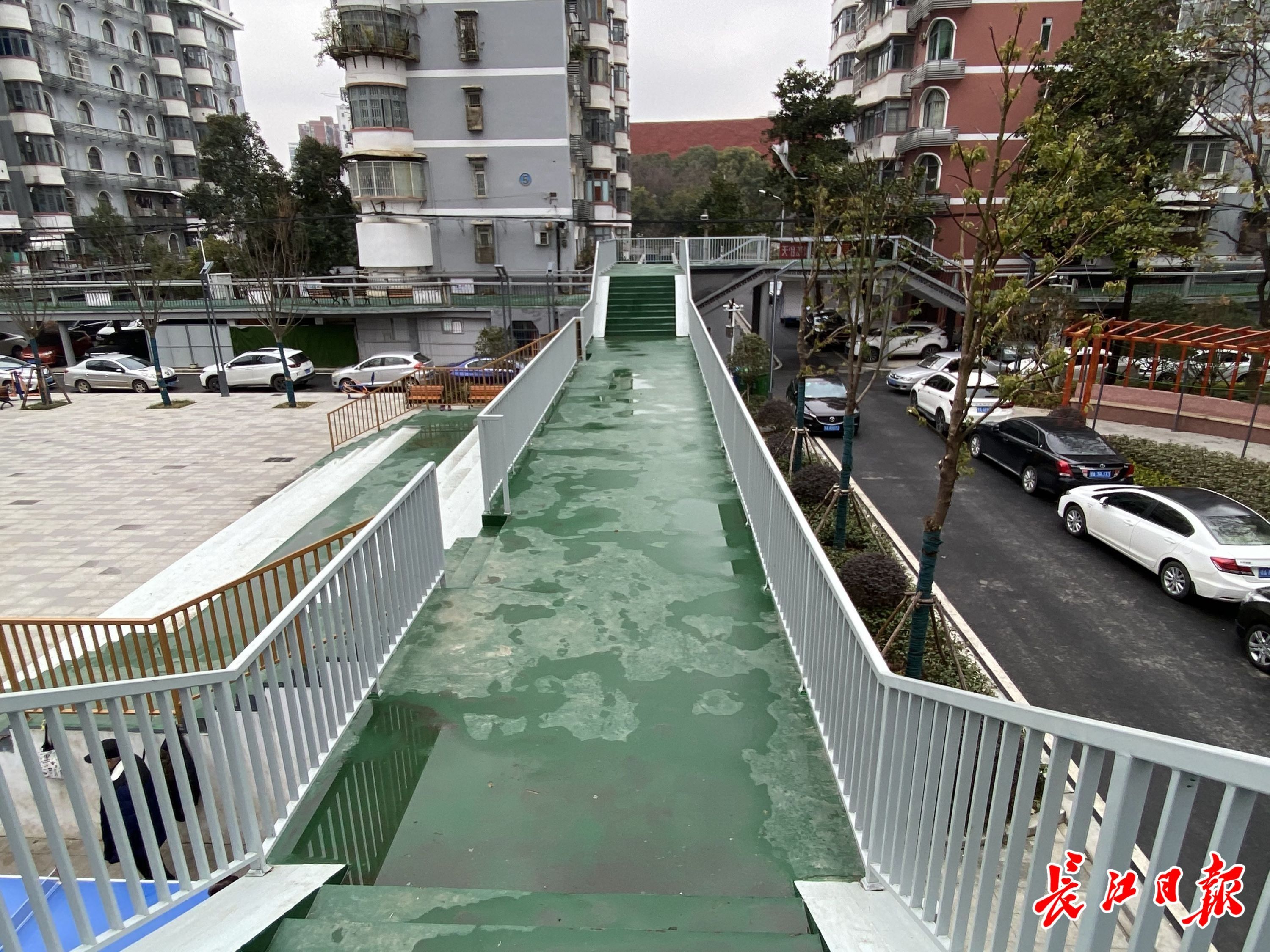 长江日报记者现场探访看到,首义小区的“空中廊桥”十分有特色,仿佛悬挂在小区上方的一块独立空间,高度在楼房二楼的位置,将整个小区的二楼空间全部连通,在廊桥上可以散步、可以观景,而现在“空中廊桥”还跟改造后的“百姓大舞台”看台连通,成为了小区里一道独特的风景线。