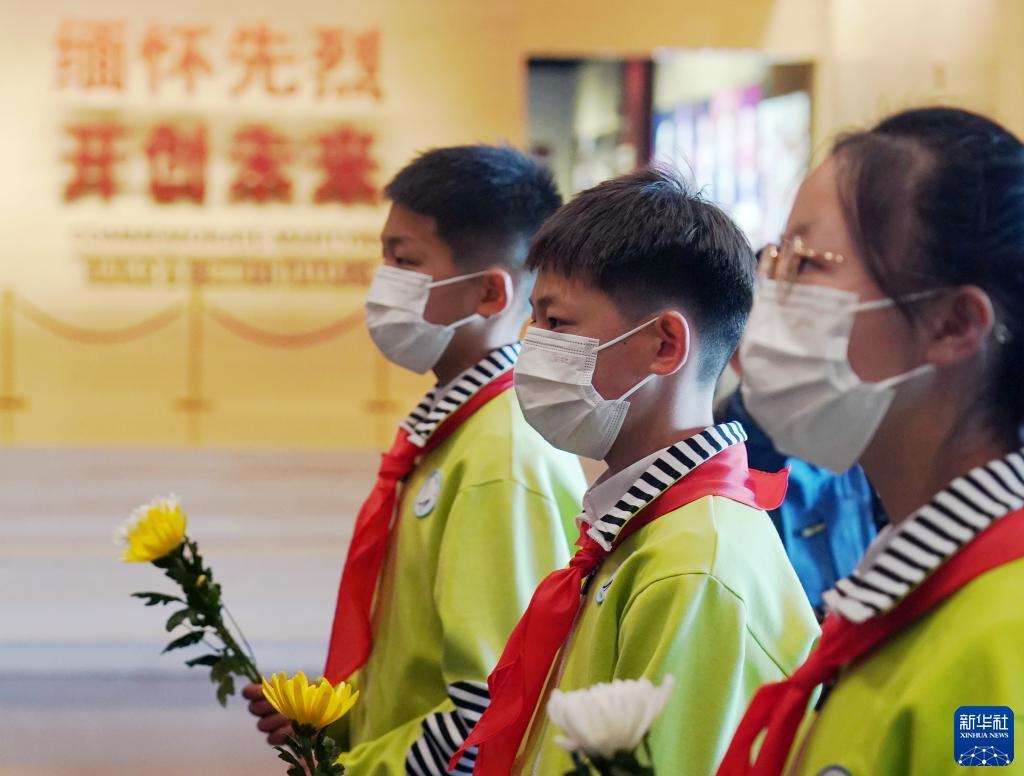 4月2日,参加活动的学生在中国人民抗日战争纪念馆向抗战英烈献花。