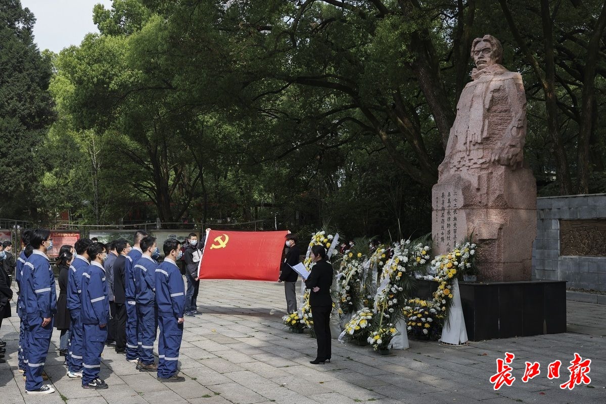 4月2日,施洋烈士陵园,中核工业工人在施洋烈士雕像下宣誓。记者胡冬冬 摄
