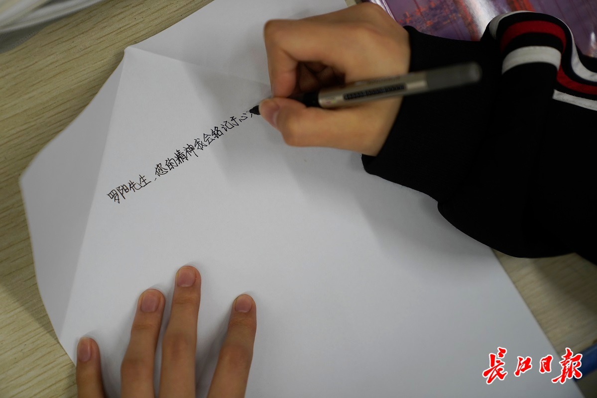武汉市四十三中学“罗阳班”的同学们在纸飞机上写下自己的感想。记者彭年 摄