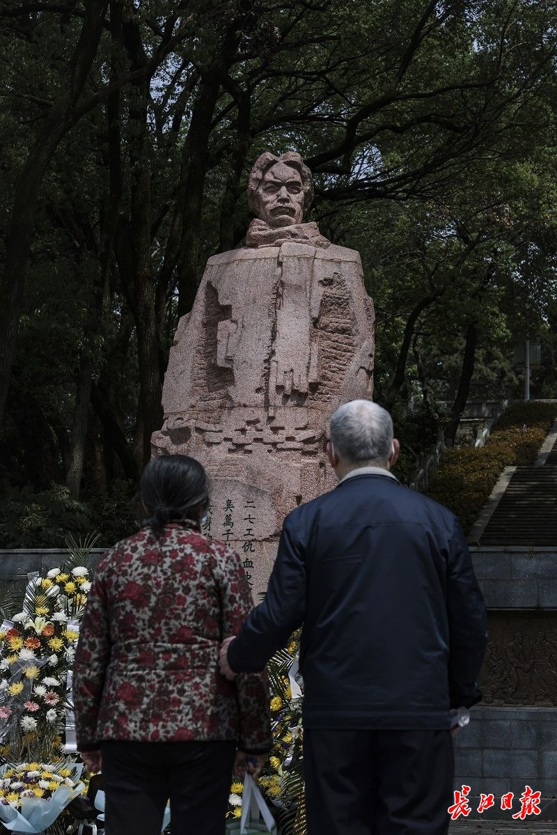 4月2日,施洋烈士陵园,一对老人在施洋烈士雕像前驻足良久。记者胡冬冬 摄