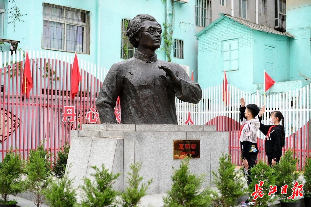 两名学生向屹立在武汉市夏明翰小学操场上的夏明翰烈士雕像致少先队礼。 长江日报记者史伟 摄