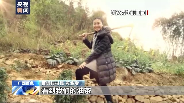 百坭村村民 黄金专:以前我们只是种了一两亩(油茶),够自己吃。然后文秀书记来到了之后,她亲自跟着我们走到山上来,看到我们的油茶,说这里应该可以扩宽一些,多种一点,以后应该有出路的。我就听她这么说,我就带动大家一起种这个油茶。现在结果了,每年我们的收入应该有三四万左右,还有其他的产业,八角、三叶青,每年平均收入应该八九万左右。我就想念她(文秀)像自己的亲人一样,没有忘记过。
