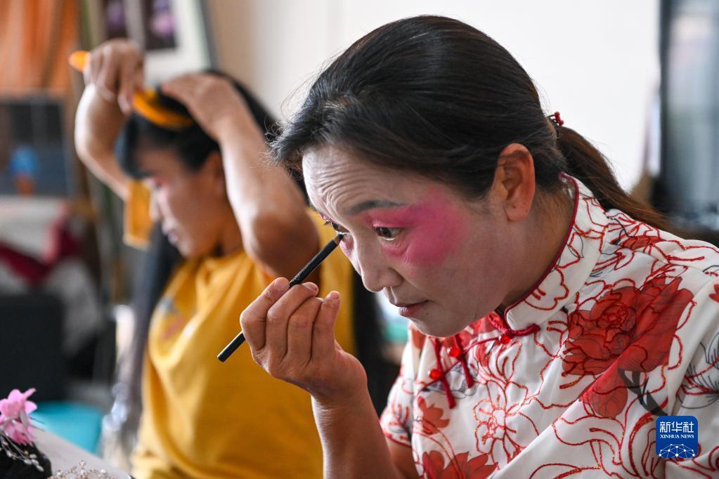 4月1日,在云南省腾冲市甘蔗寨,佤族清戏传承人王祖芳在后台化装。