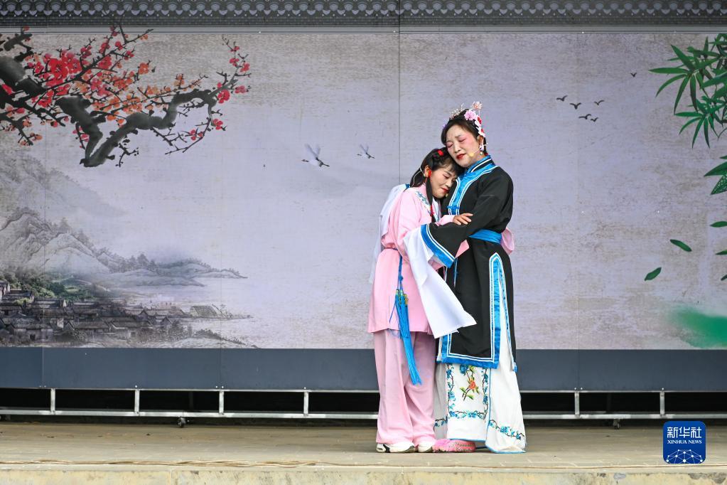 4月1日,在云南省腾冲市甘蔗寨,演员们在表演佤族清戏《安安送米》。
